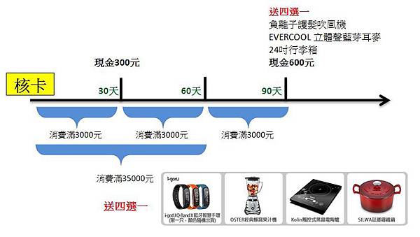 核卡後依照下面廂廂做的合併刷卡金額圖表,就可以拿到現金或贈品折合市價3500元
